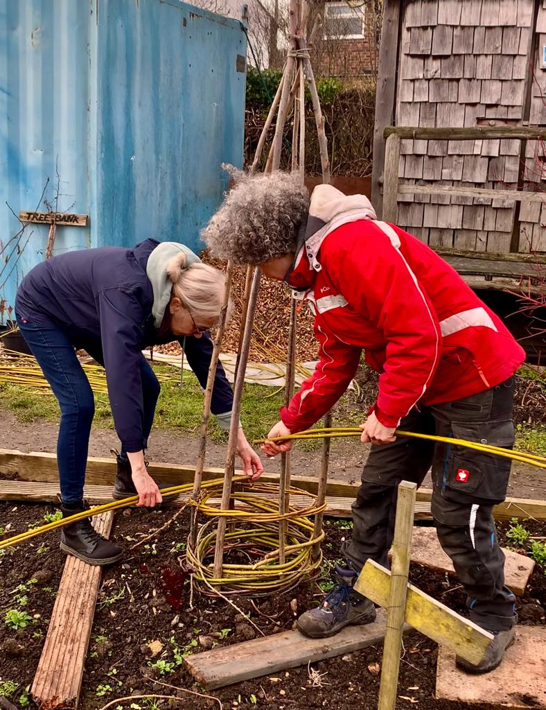 We had a very productive, if chilly month in February as well as some very strong winds to contend with. Felix helped us with cuttings and potting on, Irene prepared the ground for seed sowing with some mulch and Nicole worked on willow obelisks to support the sweet peas that will be planted in March. Early in the month we prepared the compost and heard from Jules how to take hard wood cuttings from our fruit bushes. And we also resumed our delivery of salad leaves to Gilberts Deli in Whitstable #gilbertswhit.